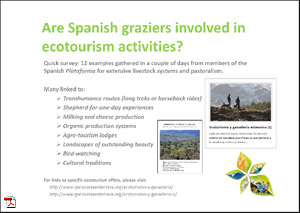 We contributed to this session by presenting several examples of nature-based tourism related to pastoralism and analysing to what extent the CAP is giving support to these HNV livestock systems. Our focus was on Spain, where we had run a survey in collaboration with the Plataforma por la Ganadería Extensiva y el Pastoralismo to explore some of the existing tourism-pastoralism initiatives. The first results of this survey have already been published online in Spanish, and were summarised in the slideshow presented at the Green Week session.