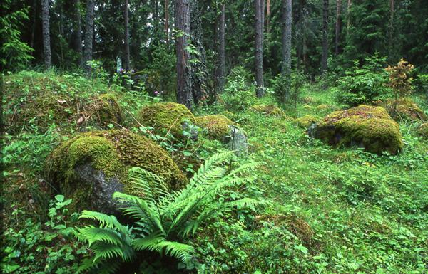 These forests grow on flat rocks and cliff faces. The pine trees (Pinus sylvestris) grow very sparsely and their roots find there way down through cracks in the cliffs and boulders. The trees grow very slowly and the ground is often covered with lichens such asreindeer moss. Where the soil is somewhat deeper shrubs such as heather (Calluna vulgaris), cowberry (Vaccinium vitis-idaea) and bilberry (Vaccinium myrtillus) grow.