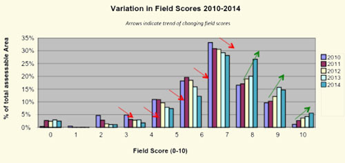 The results-based payment system allows farmers greater freedom to decide how to manage their land (with advice if needed) and also guarantees the taxpayer better value for money - no delivery, no payment! It also generates data (see graph below) which demonstrates the positive environmental impact of Burren Life. This graph shows that, between 2010 and 2014, the area of Burren grassland in very good condition (scoring 8, 9, 10) increased and the area in poorer condition (scoring 3-7) decreased.