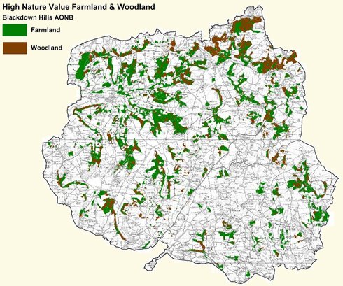 Blackdown Hills indicative map of HNV farmland and woodland, covering 16% of the 37,000 ha study area. Less than 0.1% of the identified HNV farmland and woodland is covered by Natura 2000, and less than 50% is included in county-level conservation designations. Less than 50% of the HNV farmland is participating in agri-environment measures - the national figure for all farmland is nearly 70%.